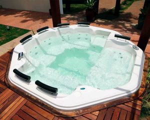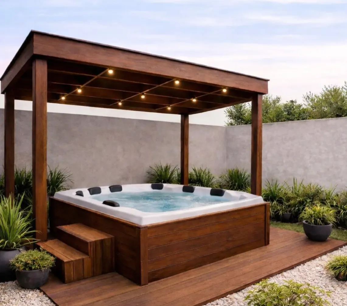 Uma SPA (hot tub ou jacuzi) é um equipamento que cabe várias pessoas, com água aquecida e jatos de massagem. É usado para relaxamento, socialização e lazer, proporcionando ótimos benefícios à saúde.